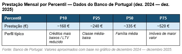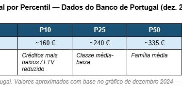 Para as prestações mensais, este alívio foi visível mas moderado. De acordo com os dados do Banco de Portugal, entre dezembro de 2024 e dezembro de 2025, as prestações mensais medianas (Percentil 50) para habitação própria permanente mantiveram-se relativamente estáveis, rondando os 330-340 euros — reflexo de um mercado onde os novos empréstimos beneficiam das descidas, mas os créditos mais antigos ainda estão em transição.