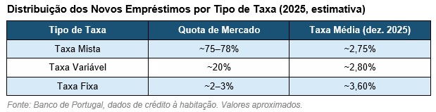 Os dados do Banco de Portugal sobre novos empréstimos em 2025 revelam uma tendência clara: a taxa mista é hoje a opção esmagadoramente preferida, representando entre 75% e 78% dos novos contratos ao longo de todo o ano. A taxa variável manteve uma fatia estável de cerca de 20%, enquanto a taxa fixa continua residual — com apenas 2% a 3% dos novos empréstimos.
